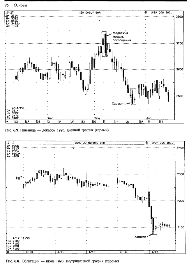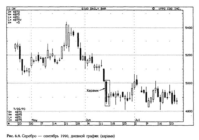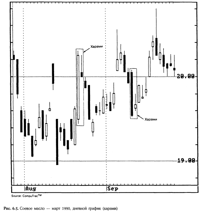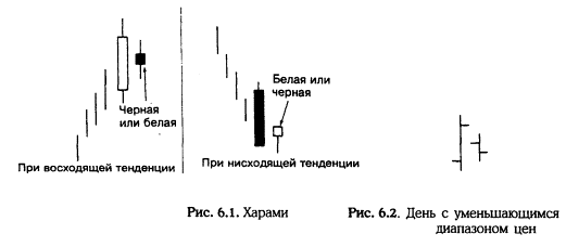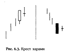 что он содержит всесильного дожи (более подробно дожи описаны в главе 8). Крест харами иногда называют «моделью, приводящей в ужас» (petrifying pattern). Как показано на рисунке 6.1, цвет второй свечи не имеет значения. Определяющими свойствами этой модели являются следующие: крохотное тело второй свечи, находящееся «внутри» предшествующего большего по размеру тела. В харами и крестах харами размеры теней также обычно не имеют значения. Харами отражает неравномерность в развитии рынка. После восходящей тенденции, завершающейся мощным белым телом, появляется
