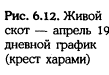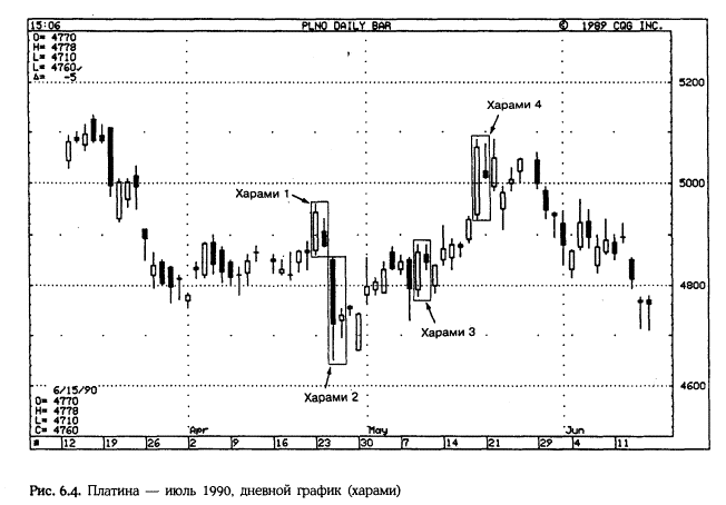 На рисунке 6.4 показан краткосрочный подъем цен, начавшийся 18 апреля. С появлением харами 1 он закончился. Последовавшее за этим падение цен завершилось образованием харами 2. Харами 3 — наглядное доказательство важности этой модели даже в условиях отсутствия на рынке ярко выраженной тенденции. Обратите внимание, что в первые дни мая на рынке не было явной тенденции. Затем появилась харами 3: маленькое черное тело — вслед за длинным белым телом (помните, что цвет второго тела не имеет значения). Для трейдера эта модель может быть сигналом того, что повышение, начавшееся вместе с появлением длинной белой свечи, не удалось. Рынок в этот момент как бы находится в нерешительности. Пока ситуация не прояснится (например, после цены закрытия, превышающей максимумы харами 3), покупать не рекомендуется. Харами 4 является классической моделью. До свечи с длинным белым телом на рынке отчетливо просматривалась восходящая тенденция. С появлением на следующий день свечи с маленьким телом модель «харами» окончательно сформировалась. Свеча с маленьким телом по внешнему виду весьма напоминает падающую звезду (хотя и не является идеальной звездой, поскольку ее тело не располагается выше тела предшествующей свечи). На рисунке 6.5 представлены великолепные образцы харами. Тело второй свечи в каждой из моделей является крохотным по сравнению с телом предыдущей свечи. Первая харами свидетельствует о том, что силы, двигавшие рынок вверх, исчерпаны, а вторая — о том, что ослабевает давление продавцов. На рисунке 6.6 показано, как две свечи модели «харами» предсказали вершину рынка в конце марта. Падение цен продолжалось до появления