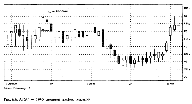 «Прикройте крышкой то, что дурно пахнет» Модели разворота, описанные в главах 4 и 5, являются сравнительно сильными сигналами изменения тенденции. Они показывают, что быки перехватили инициативу у медведей (как в бычьей модели поглощения, моделях «утренняя звезда» и «просвет в облаках») или, что медведи одолели быков (как в медвежьей модели поглощения, моделях «вечерняя звезда» и «завеса из темных облаков»). В этой главе описываются другие индикаторы разворота, которые обычно (хотя и не всегда) являются менее сильными сигналами. К ним относятся модель «хорами», вершины и основания «пинцет», свеча «захват за пояс», модели «две взлетевшие вороны» и «контратака». Здесь также исследуются такие сильные сигналы разворота, как «три черные вороны», «три горы», «три реки», «пологая вершина», основание «сковорода», вершина и основание «башня». Модель «харами» (harami pattern)Модель «харами» (см. рис. 6.1) — это свеча с маленьким телом, которое находится в пределах сравнительно длинного тела предшествующей свечи. «Харами» — древнее японское слово, означающее «беременная». Длинная свеча — это «мать», а маленькая свеча — «ребенок», или «плод». Мы уже отмечали в главе 3, что свечи-волчки (т.е. свечи с маленьким телом) являются важной составной частью некоторых моделей. Одной их таких моделей является харами (другой такой моделью является звезда, описанная в главе 5).
