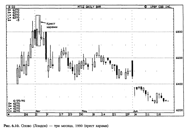 бычьего молота 24 апреля. Обратите внимание, что тень второй свечи в модели «харами» оказалась за пределами тела предшествующей свечи. Это показывает, что в данной модели важным является соотношение тел, а не теней. На рисунке 6.7 мы видим резкое понижение цен, начавшееся после появления 7 и 8 мая медвежьей модели поглощения. Харами послужила сигналом перехода нисходящей тенденции в горизонтальную. Внутридневные трейдеры могли бы использовать харами, представленную на рисунке 6.8, как сигнал возможного завершения предшествующей внутридневной тенденции и принять соответствующие меры. В данном примере резкое падение цен в начале дня 17 апреля закончилось с появлением харами, и рынок встал. Эта харами могла послужить трейдерам, играющим на внутридневных колебаниях цен, как сигнал для закрытия коротких позиций. Как любая модель разворота в основании, данная харами не исключает того, что понижение рынка будет продолжаться. Тем не менее, она сообщает нам об определенном состоянии рынка — в частности, о том, что, по крайней мере, в период ее формирования давление медведей ослабло. На рисунке 6.9 представлен прекрасный пример того, как после появления харами ярко выраженная нисходящая тенденция превратилась в горизонтальную. На графике видно, что цены, стремительно упавшие с 5,40 до 4,85 долл., остановились у харами. Но появление харами вовсе не означает, что цены начнут расти. После этой модели рынок обычно входит в полосу застоя. Крест харами (Harami Cross)Классическая модель «харами» состоит из двух свечей: за свечой с длинным телом следует свеча с меньшим телом. Но строгих правил относительно того, что считать «маленьким» телом, не существует. В данном случае, как и во многих других методиках графического анализа, допускается известная доля субъективности. Общий принцип гласит: чем меньше второе тело, тем большую значимость имеет модель. И это понятно: меньшее по размеру тело свечи убедительнее демонстрирует противоречивую ситуацию на рынке, в результате которой может произойти изменение тенденции. В экстремальных случаях, когда расхождение между ценой закрытия и ценой открытия сводится к минимуму, а тело соответственно уменьшается, образуется дожи. Как указывалось выше, дожи, появляющийся после свечи с длинным телом, называется «крест харами». Крест харами заключает в себе более