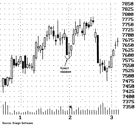 важную информацию, чем классическая модель «харами». Так харами не относится к числу важнейших моделей разворота, а крест харами является таковой. Если трейдер, имеющий длинную позицию, игнорирует крест харами, появившийся после свечи с очень длинным белым телом, то он сильно рискует. Кресты харами могут образовываться и в основании, но они более эффективны на вершине. На рисунке 6.10 видно, что с появлением креста харами 2 и 3 апреля резко оборвалась восходящая тенденция, продолжавшаяся с середины марта. На рисунке 6.11 показано, как ценовой разрыв вверх, образовавшийся в середине января, буквально «кричал» о том, что рынок стал бычьим. Но крест харами возразил: сейчас не время для бычьего рынка. На рисунке 6.12 видно, как дожи, появившийся после необычно длинной черной свечи, сформировал модель «крест харами». На этом предшествующая нисходящая тенденция завершилась. Молотообразная свеча, возникшая после дожи из креста харами (и успешно проверившая уровень недавних минимумов), явилась еще одним доказательством того, что рынок достиг основания.