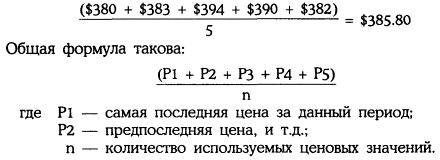 «Сколько голов — столько умов» Скользящее среднее — один из старейших и наиболее распространенных инструментов технического аналитика. Он силен тем, что отслеживает движение тенденции, позволяя определить ее основное направление. Поэтому наибольший эффект он дает при анализе рынков с ярко выраженной направленностью. Вместе с тем, будучи запаздывающим индикатором, скользящее среднее улавливает тенденцию лишь спустя некоторое время после ее начала. Простое скользящее среднее значениеИсходным в группе скользящих средних является (что выражено в самом его названии) простое скользящее среднее значение. Это среднее арифметическое всех используемых ценовых значений. Допустим, последние пять цен закрытия на рынке золота были 380, 383, 394, 390 и 382 долл. Тогда их 5-дневное скользящее среднее составляет:
