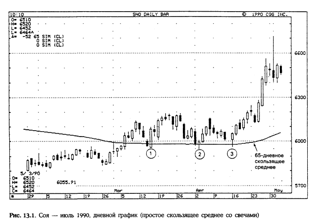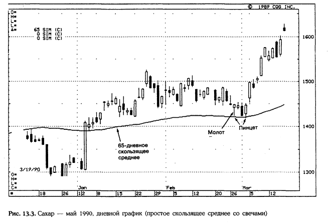 Как видно из рис. 13.2, совокупность технических факторов, которые пришлись на 2 и 3 апреля, должна была послужить внимательному аналитику серьезным предостережением. Рассмотрим эти факторы: 1. В начале марта цены опустились ниже кривой 65-дневного скользящего среднего. С этого момента она стала линией сопротивления. 2. Две свечи — 2 и 3 апреля — образовали завесу из темных облаков, которая также стала успешной проверкой сопротивления на уровне скользящего среднего. 3. 3 апреля ознаменовалось не только завесой из темных облаков и проверкой сопротивления на уровне скользящего среднего: максимум, достигнутый ценами в этот день, оказался в пределах 7 тиков от уровня 50%-ной коррекции спада А-В. На рис. 13.3 показано, что проверка линии поддержки 65-дневного скользящего среднего в конце февраля была подкреплена молотом. Через несколько дней рынок перепроверил эти минимумы, в ходе чего образовалось основание «пинцет».