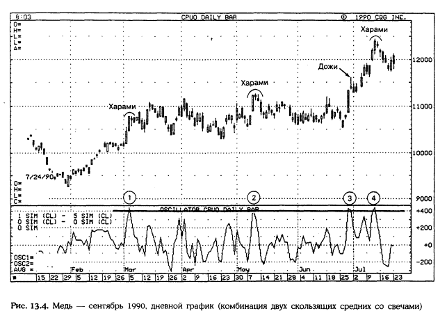 Комбинация из двух скользящих среднихСуществует множество вариантов использования комбинации из двух скользящих средних. Один из них — в качестве осциллятора или индикатора перекупленности/перепроданности. Этот индикатор определяют как разность между длинным и коротким скользящими средними. Его значения могут быть как положительными, так и отрицательными. Величина выше нуля означает, что короткое скользящее среднее находится над длинным. Всякая величина ниже нуля означает, что короткое скользящее среднее расположено под длинным. Таким образом, сопоставляется темп движения обеих кривых. Это связано с тем, что, как говорилось ранее, короткое скользящее среднее более чувствительно к последним изменениям цен. И если оно сравнительно намного выше (или ниже) длинного скользящего среднего, то рынок считается перекупленным (перепроданным). Другой вид применения комбинации двух скользящих средних — наблюдение за их пересечениями. Если короткое скользящее среднее пересекает длинное, то это может быть ранним признаком изменения тенденции. Характерный бычий сигнал — короткое скользящее, пересекающее длинное снизу вверх. Японские аналитики называют подобное пересечение «золотой крест» (golden cross). Допустим, 3-дневное скользящее пересекает 9-дневное снизу вверх: это и есть золотой крест. Обратная ситуация в Японии именуется «мертвый крест» (dead cross). Это медвежий сигнал, который появляется тогда, когда короткое скользящее среднее пересекает длинное сверху вниз. Для получения краткосрочного индикатора перекупленности/пере-проданности некоторые аналитики соизмеряют текущую цену закрытия с 5-дневным скользящим средним. (См. рис. 13.4.) Например, если 5-дневное среднее равно 1,10 долл., а сегодняшняя цена закрытия — 1,14, то показатель перекупленносги составляет 0,04 долл. В данном примере нижняя кривая графика представлена разностью между значением текущей цены закрытия и 5-дневным скользящим средним. Из графика видно: когда эта кривая достигает отметки перекупленносги около 400 пунктов (т.е. 0,04 долл.), рынок становится уязвимым — особенно, если это сопровождается подтверждающим медвежьим сигналом свечей. На временном отрезке 1 показание перекупленносги дополняется моделью «харами», на отрезке 2 появляется еще одна харами, на отрезке 3 — дожи, на отрезке 4 — опять харами. Выходом из состояния перекупленное™ может быть либо снижение цен, либо их переход в нейтральный торговый коридор. В анализируемом случае перекупленность на отрезках 1 и 3 была снята переходом в нейтральный коридор. На отрезках 2 и 4 цены упали. В условиях перекупленного рынка обычно не следует открывать короткие позиции. Однако обла-