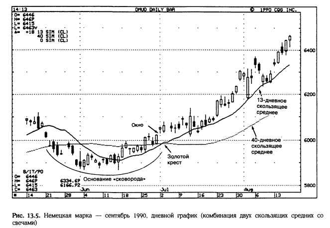 дателям длинных позиций принять защитные меры необходимо. Обратное справедливо для состояний перепроданное™. Комбинацию из двух скользящих средних можно графически представить в виде двух кривых, наносимых на ценовой график. Как отмечалось ранее, когда короткое скользящее среднее пересекает длинное снизу вверх, образуется так называемый золотой крест. Подобное пересечение является бычьим сигналом. На рис. 13.5 представлены бычий золотой крест и основание «сковорода». Формирование «сковороды» было подтверждено окном, появившимся 2 июля. Обратите внимание, что в первой половине июля окно выступило в роли уровня поддержки и что потом, по мере роста цен, эту роль выполняла кривая короткого скользящего среднего. Разность между двумя скользящими средними также используется для выявления расхождений (divergences). По мере повышения цен короткое скользящее среднее должно расти быстрее по сравнению с длинным, то есть положительные значения кривой разности должны расти. Если цены идут вверх, а разность между скользящими сокращается, — это сигнализирует о том, что короткое скользящее среднее теряет темп, выдыхается. Значит, подъем может скоро закончиться. На рис. 13.6 представлена гистограмма двух скользящих средних.