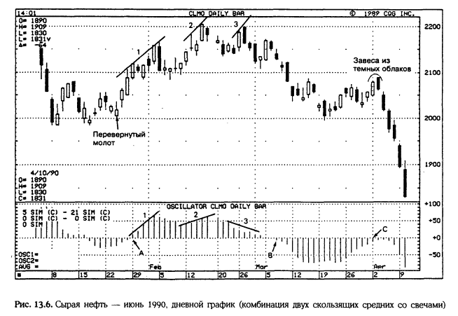 На отрезках 1 и 2 рост цен сопровождался увеличением положительной разности между коротким и длинным скользящими средними. Значит короткое скользящее среднее растет быстрее длинного, что ясно указывает на продолжение восходящей тенденции. Отрезок 3 — это период осложнений на рынке. Подъем на 0,50 долл., который начался 23 февраля, отразился в сокращении разности между скользящими средними. Это говорит об ослаблении темпа короткого скользящего среднего. Если учесть образование завесы из темных облаков, то совокупность этих признаков указывает на возможность ценового отката. Из гистограммы также видно, когда короткое скользящее среднее пересекает длинное снизу вверх, а когда — сверху вниз. В первом случае гистограмма поднимается выше нулевой отметки, во втором — опускается ниже. Таким образом, если показатель осциллятора меньше О, то налицо медвежий мертвый крест; а если больше, то это бычий золотой крест. В области А наблюдался золотой крест, а за несколько дней до него — бычий перевернутый молот. В области В был мертвый крест. В области С цены росли, но короткое скользящее среднее так и не сумело подняться выше длинного (т.е. осциллятор оставался ниже О). Кроме того, с образованием 2 и 3 апреля завесы из темных облаков прозвучал еще один медвежий сигнал.