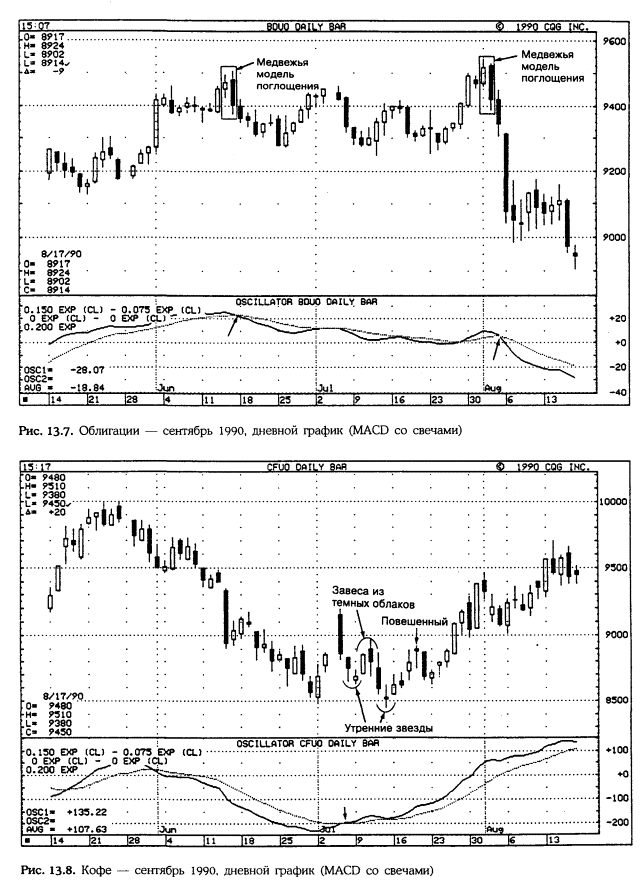 Индикатор MACD представлен двумя линиями (см. нижний график на рис. 13.7). Более подвижная сплошная линия — это сигнальная линия. Сигнал к продаже возникает в том случае, когда сигнальная линия пересекает пунктирную, более сглаженную, сверху вниз. В данном примере медвежий потенциал двух медвежьих моделей поглощения бьы усилен медвежьими пересечениями индикаторов MACD (см. стрелки). На рис. 13.8 видно, что в начале июля сигнальная линия MACD поднялась над более медленной (см. стрелку). Это являлось серьезным указанием на возможный разворот цен. Если посмотреть на график свечей, то выясняется, что бычий характер первой утренней звезды был аннулирован завесой из темных облаков. Падение цен от этой завесы завершилось появлением еще одной утренней звезды. После временного отката, отмеченного повешенным, возобладала подъемная сила рынка. [ Prev ] [ Content ] [ Next ] |