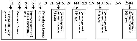 Рис.2. Одна из авторских интерпретаций иллюстрации связи между последовательностью Фибоначчи и компонентами фрактальной модели Эллиота. Обратите внимание на то, что волна данной степени соответствует четному числу Фибоначчи и состоит из импульса и коррекции, которым сопоставляются 2 предыдущих нечетных члена последовательности.
