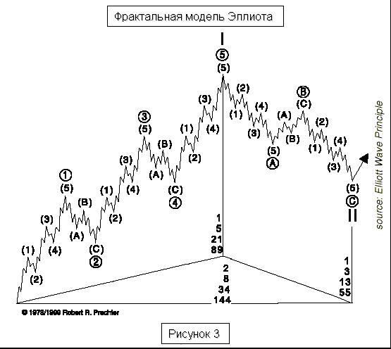В теории Эллиота вводится понятие нумерации волн. Здесь имеются в виду числовые обозначения векторных составляющих модели. На рис.3 фрактальная модель изображена уже в "пронумерованном" виде: каждой волне определенной степени в пределах данной детализации сопоставлены соответствующие числа последовательности Фибоначчи. Такая модель называется волновой диаграммой Пречтера.